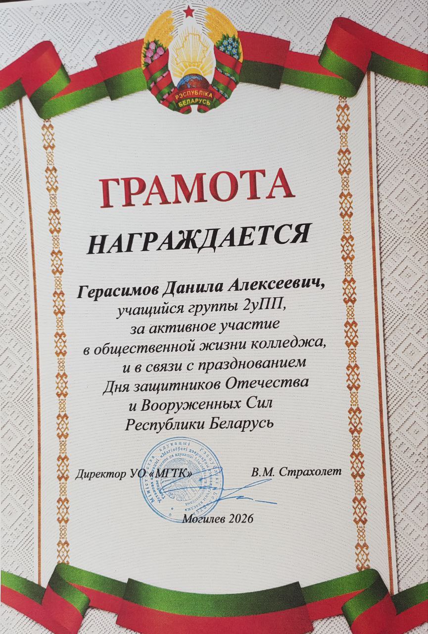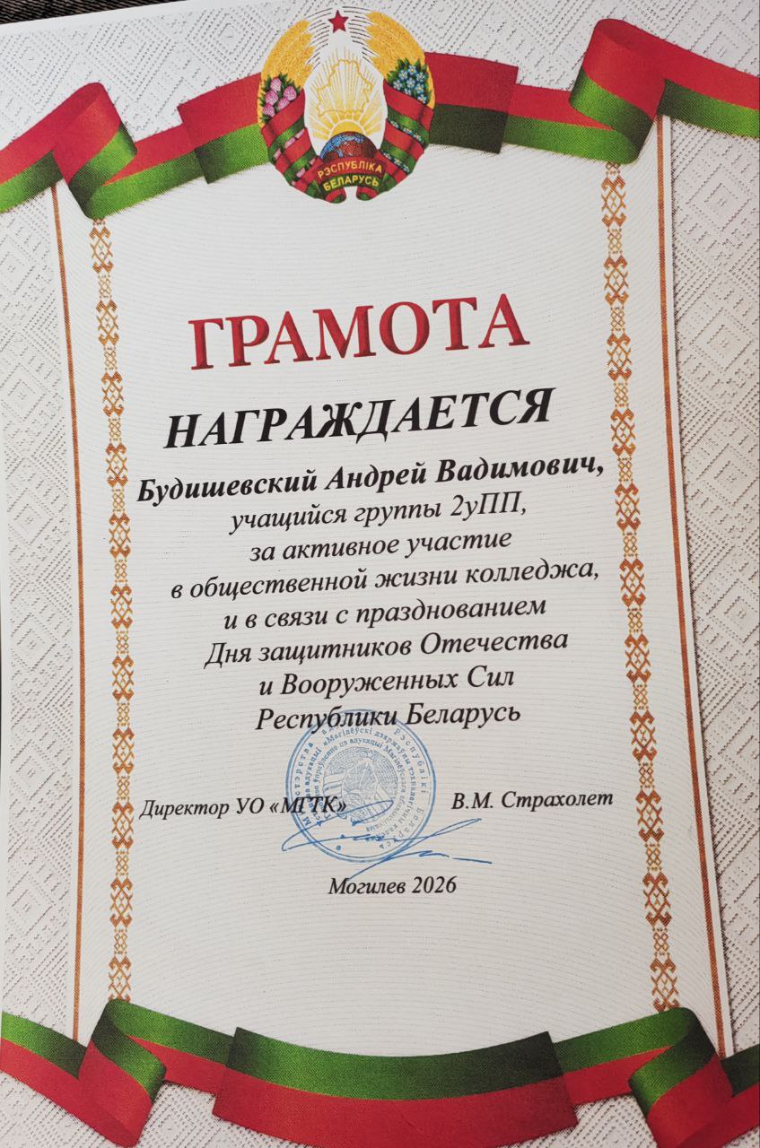 23 февраля 2026 года наша страна традиционно отмечает День защитника Отечества — праздник мужества, доблести и чести. В УО «Могилевский государственный технологический колледж» этот день стал особенным не только благодаря поздравлениям, но и церемонии награждения тех, кто вносит реальный вклад в безопасность и порядок.