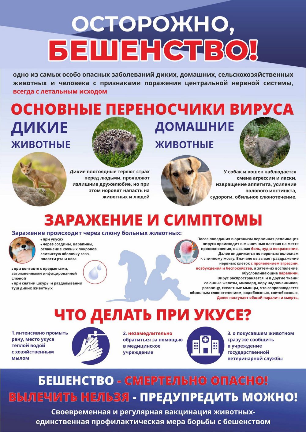 Помните, что бешенство – это абсолютно смертельное заболевание. Единственным эффективным средством профилактики является своевременное оказание антирабической помощи лицам, пострадавшим от контакта с животным, в том числе проведение иммунизации против бешенства.