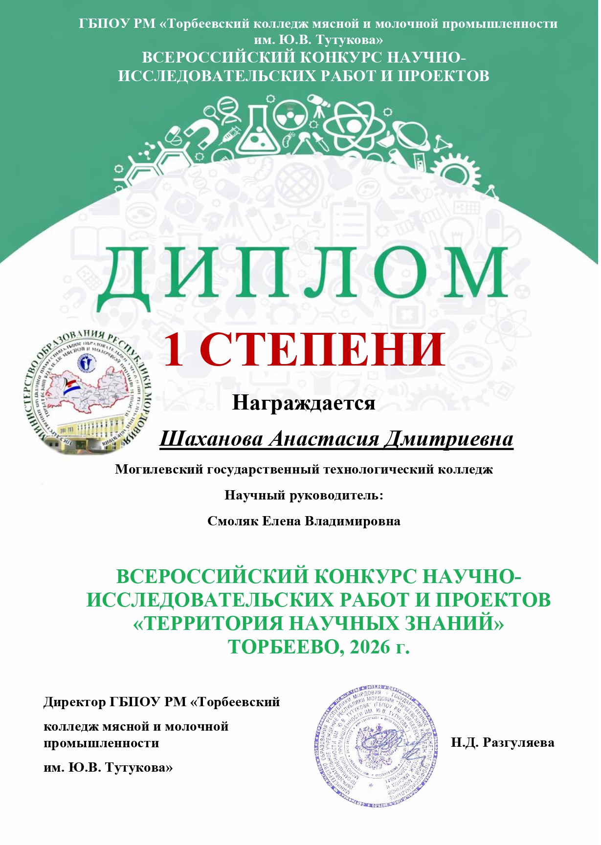 Выпускница нашего колледжа гр. 4ПП Шаханова А.Д. в январе месяце приняла участие во Всероссийском конкурсе научно–исследовательских работ и проектов «Территория научных знаний», посвященного памяти Ю.В. Тутукова (с международным участием).