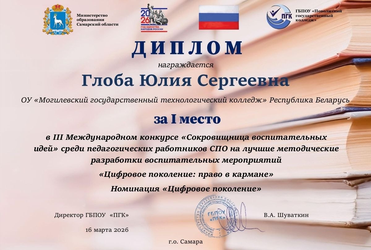 Руководитель по военно-патриотическому воспитанию Юлия Сергеевна Глоба стала обладателем диплома I степени в номинации «Цифровое поколение» с методической разработкой «Цифровое поколение: право в кармане».